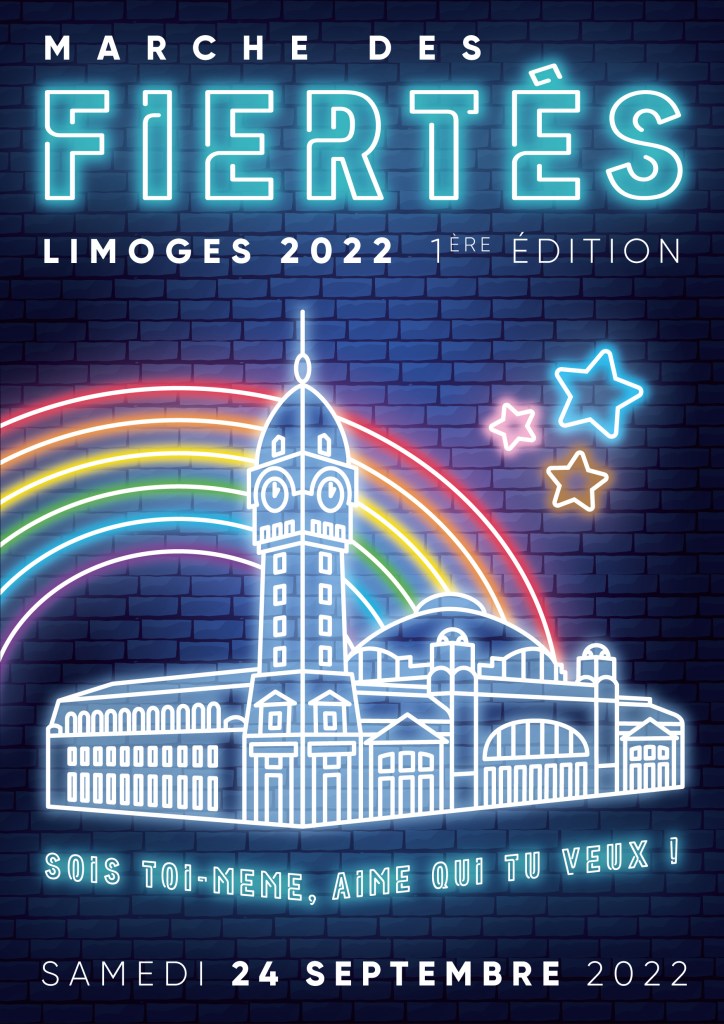 La toute première marche des fiertés de Limoges qui se tiendra le 24 septembre 2022, place de la motte à Limoges. Cette dernière est organisée par le collectif de lutte contre les LGBTQI phobies Lim’Bow, dont notre partenaire, Entr’AIDS est membre.